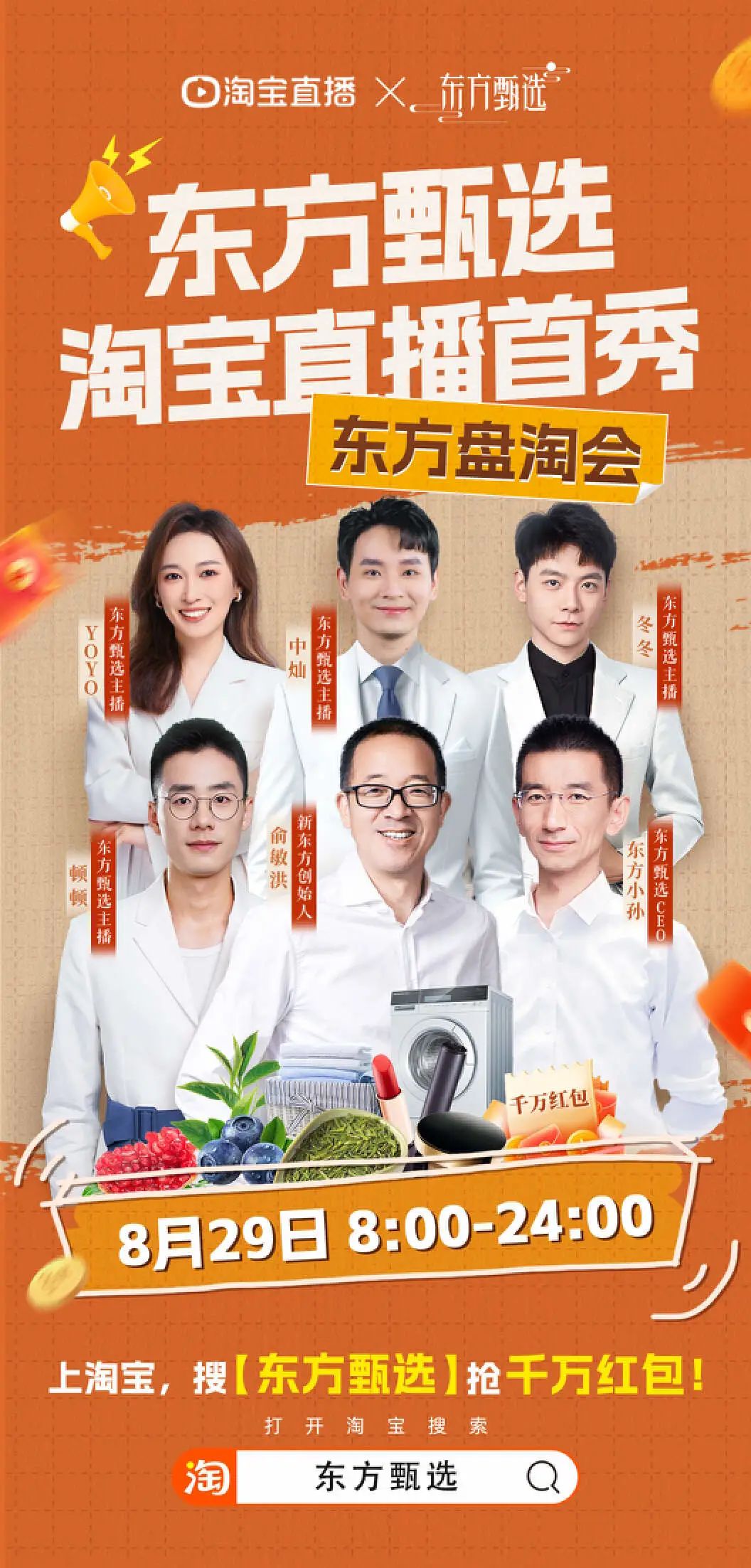 今天,东方甄选官宣将于8月29日入淘开播,新东方创始人俞敏洪、东方甄选CEO东方小孙亲自带队。