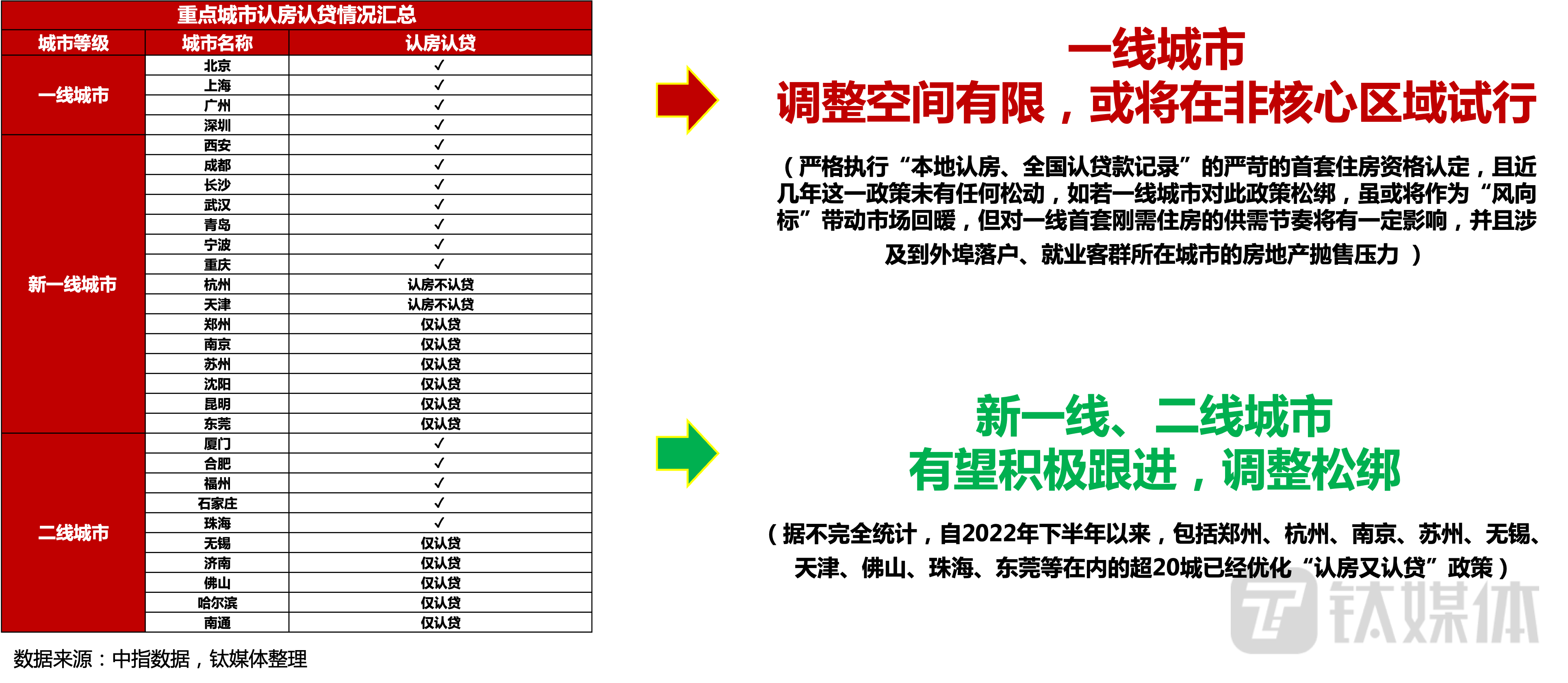 对于四大一线城市,当前均严格执行“本地认房、全国认贷款记录”的严苛的首套住房资格认定,且近几年这一政策未有任何松动,同时如若一线城市对此政策全面松绑,虽或将作为“风向标”带动市场回暖,但对一线首套刚需住房的供需节奏将有一定影响,并且涉及到外埠落户、就业客群所在城市的房地产抛售压力,因此四大一线城市有望松绑但空间有限,或将可能在非核心区域试行。