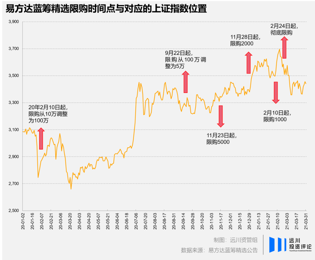 张坤不是没有意识到风险,从2020年9月份开始,张坤的产品即开启限购,并且限购的额度从5万开始不断收紧,到市场整体见顶之后的2月24日张坤直接彻底限购不卖了。