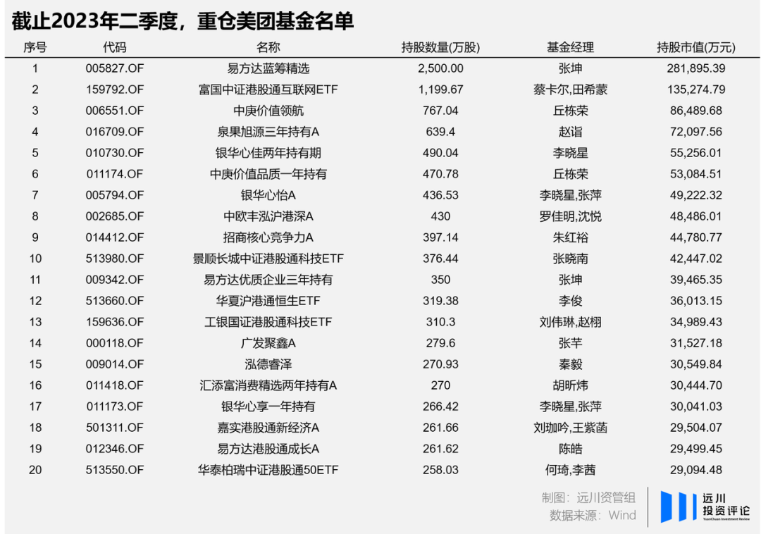 美团可能是少有的几家股价几经波折之后仍能将诸多基金经理团结在身后的公司之一。截止23年上半年,美团股价距离21年初的高点已经回调超过70%,但重仓美团的基金名单依然称得上群星璀璨。