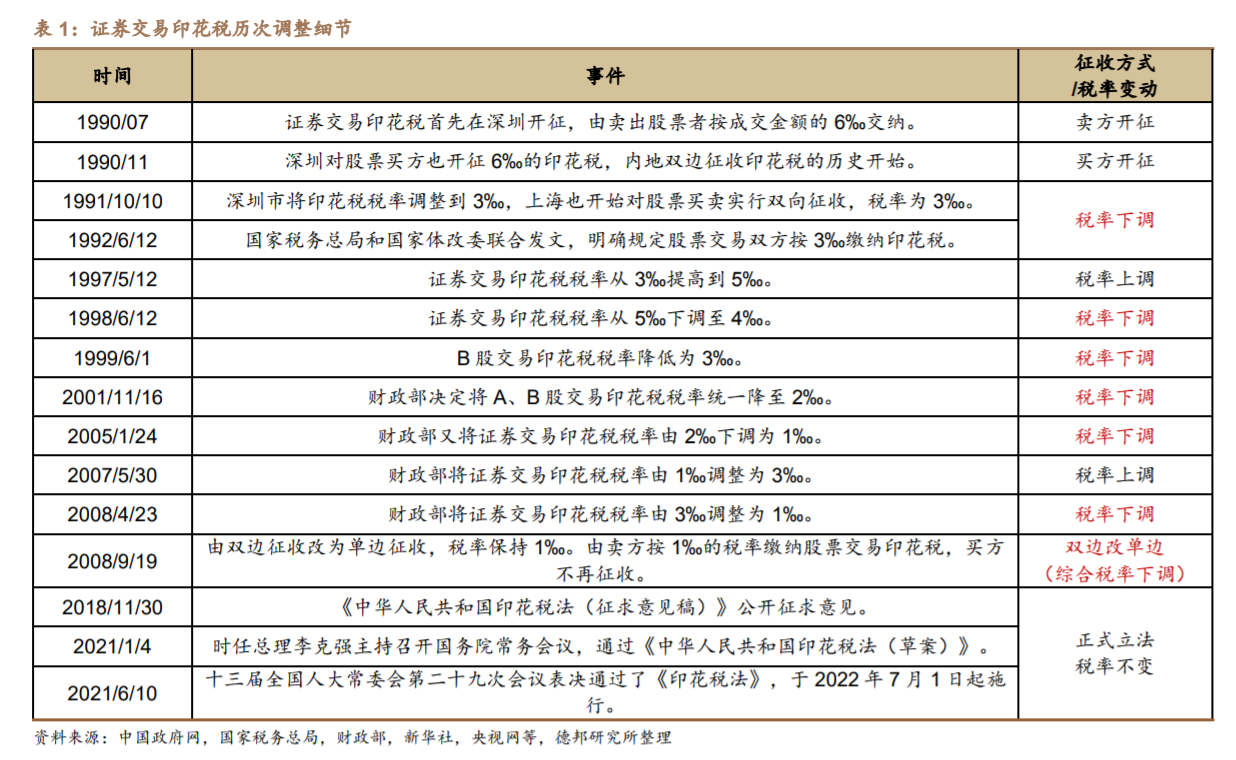 据了解,我国的证券交易印花税始于1990年,由深圳证券交易所和上海证券交易所先后开征。1990年至今,A股证券交易印花税经历2次上调,7次下调,目前按股票交易成交金额的1‰对卖方单边征收。