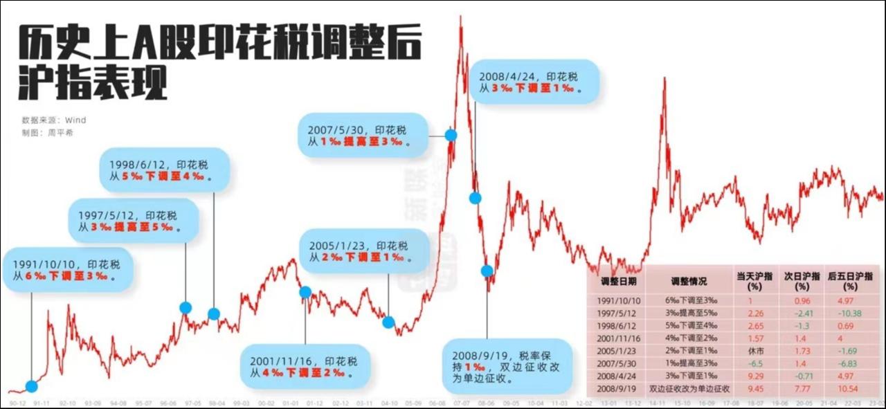 中泰证券策略研究负责人徐驰表示,减半征收印花税、收紧IPO节奏、规范上市公司减持行为、降低融资保证金最低比例等一系列政策齐出,是此前“要活跃资本市场,提振投资者信心”在政策层面的实质性落地。以史为鉴,每一次印花税调降后,投资者信心都会得到一定程度修复,市场上涨概率较大。因此,此次打出“组合拳”有望为市场带来一轮反弹行情。