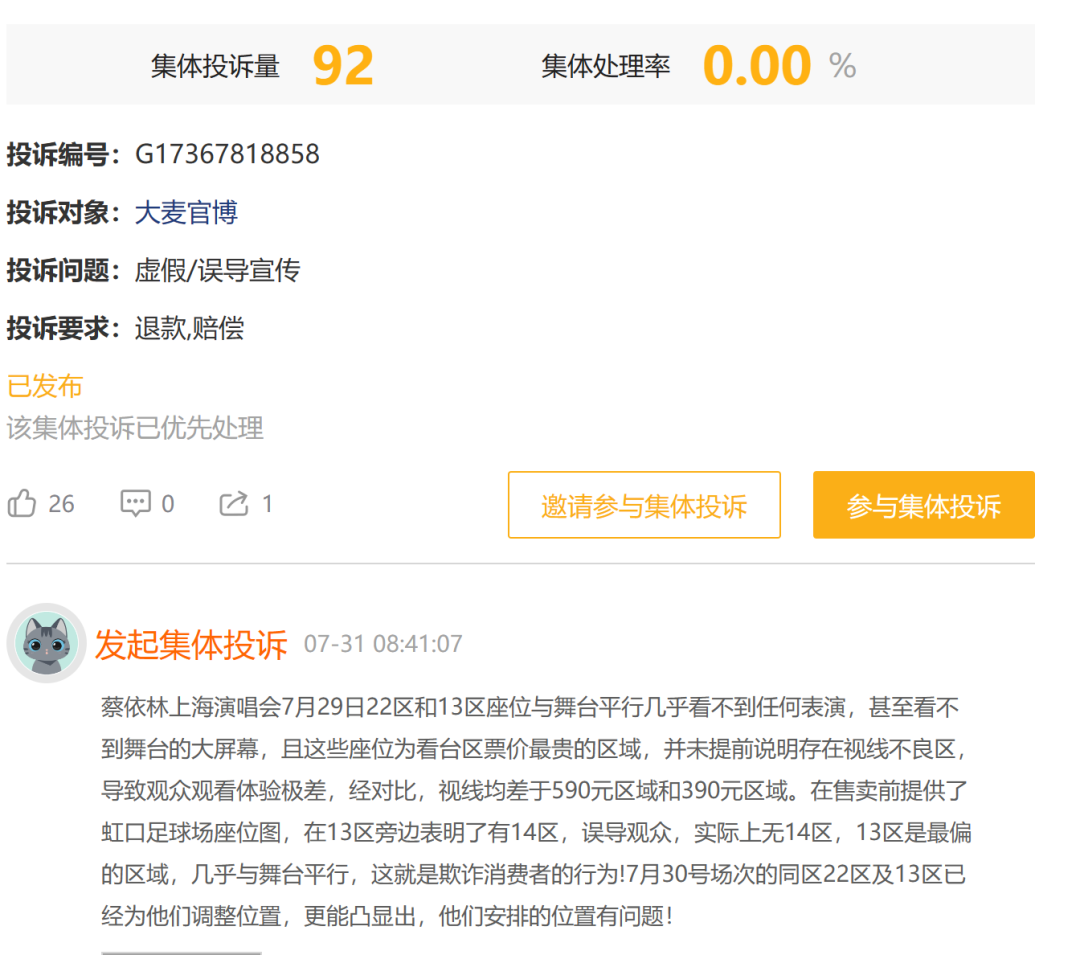 尤其是7月末8月初,新浪黑猫投诉平台上涌入消费者的集体投诉。有接近100宗投诉称,7月29日蔡依林上海演唱会看台区票价最贵的区域视线不良,导致观看体验极差,消费者认为在购票时,大麦网提供的座位图与实际场地不符,存在误导观众的问题,涉嫌消费欺诈。