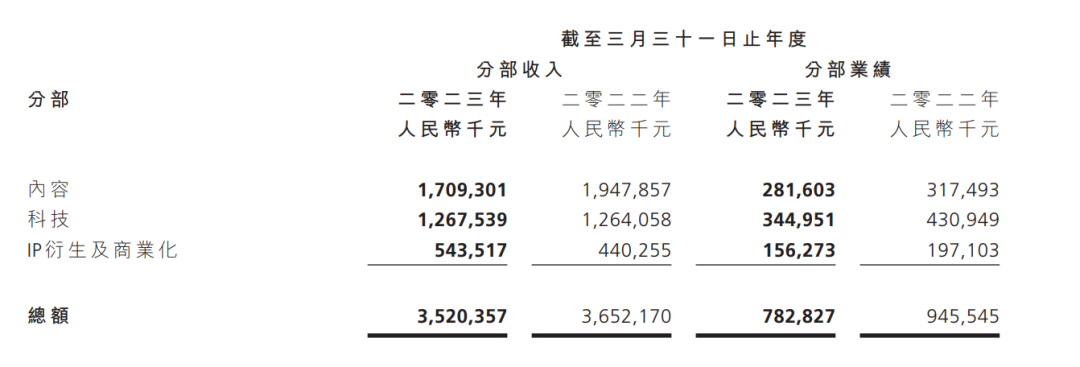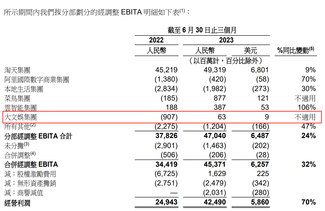 然而,2023年第二季度(2024财年第一季度),在六大业务集团中,大文娱集团实现营收53.81亿元,以35.7%的同比增速紧随国际数字商业其后,更重要的是,经调整EBITA同比扭亏为盈,从去年同期的净亏损9.07亿变为盈利6300万元。