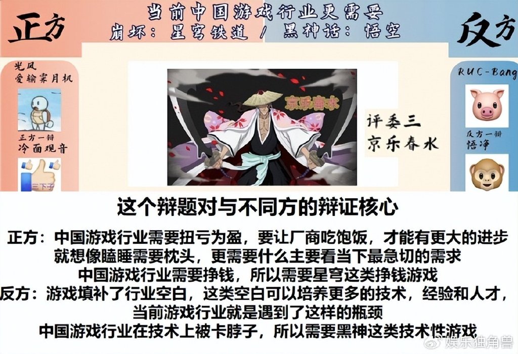 昨日(8月27日),以“星穹铁道/黑悟空,中国游戏行业未来向何方?”为辩题的华语辩论赛落幕,吸引大批游戏乐子人前来分享观点。最终反方观点“当前中国游戏行业更需要《黑神话:悟空》(这类3A大作)”,以4:1的比分拿下了比赛,有趣的是,现实却正呈现出相反的局面。