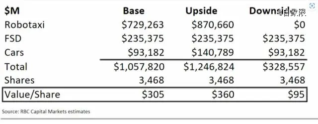 7月19日,加拿大*银行资本市场分析师Tom Narayan为特斯拉的业务进行估值,他在报告中认为,特斯拉汽车业务的估值约为931.82亿美元;FSD业务的估值约为2353.75亿美元;robotaxi业务的估值约为7292.63亿美元,要远远超过FSD和汽车业务。