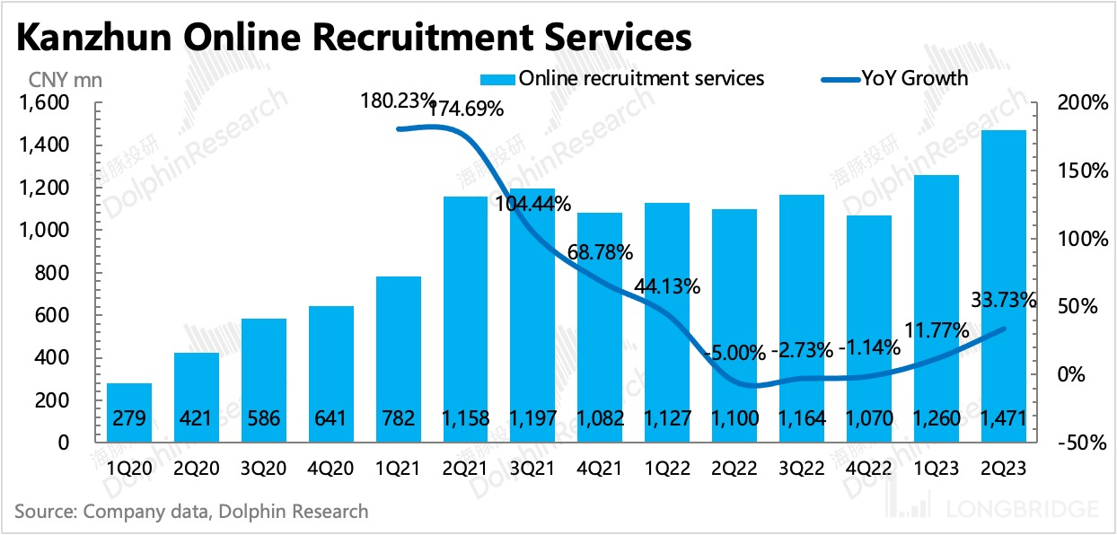 招聘平台的金主是企业方,BOSS 直聘上网络招聘收入也是占比 98.9%,因此总收入增速跟着企业付费来,二季度在低基数下加速增长。