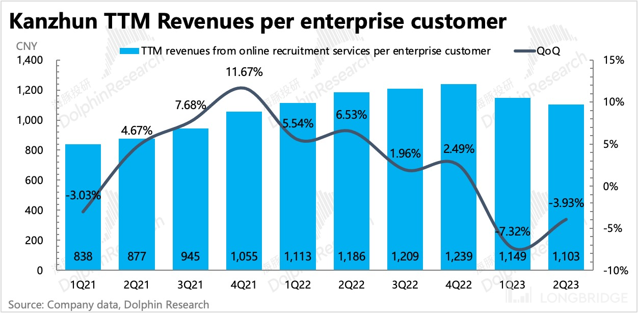但一季度的 TTM 流水,相比二季度的 TTM 流水,包含了去年最差的 Q2。因此说明剔除掉疫情期的干扰因素,平台本身的企业平均付费确实是在走低的。
