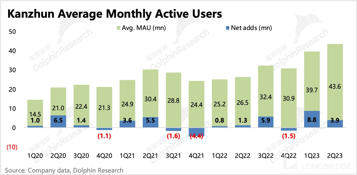 二季度,公司月活环比净增近 400 万用户,达到 4360 万人,突破新高。也就是说,由于宏观压力,公司对求职群体不用过多的营销投放,就自然涌入了很多新增注册和用户新增,其中应届毕业生以及公司下沉战略下的求职者居多,但存量的一二线白领用户同样增加了登录 BOSS 直聘的频率。