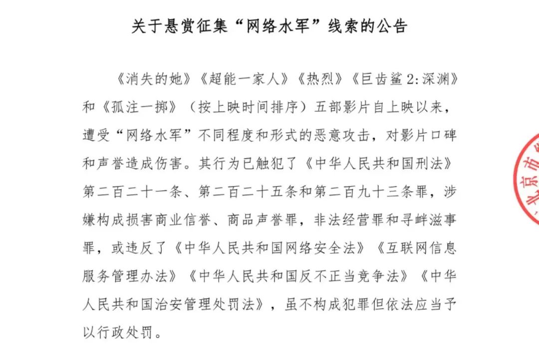 8月25日,#五部暑期档电影联合抵制网络水军#的话题登上微博热搜,原来是《消失的她》《超能一家人》《热烈》《巨齿鲨2:深渊》《孤注一掷》五部影片联合发布了一则《关于悬赏征集“网络水军”线索的公告》,希望有人能提供涉及五部影片“黑水军”的相关线索和证据,一经查实给予总金额不超过300万元的奖励。