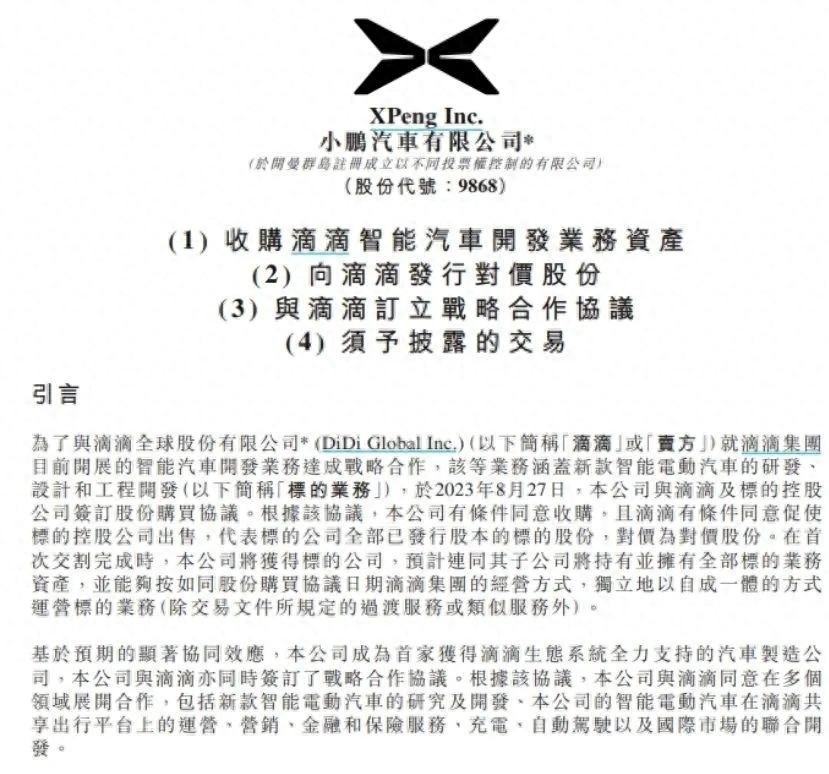 18年后的2023年8月28日,曾任职过过阿里移动事业群总裁的何小鹏,再现了马云当年的神操作:营收持续下滑、上半年净亏了51.42亿的小鹏汽车,官宣用最高总对价58.35亿港元,“收购”了滴滴智能汽车开发业务资产。