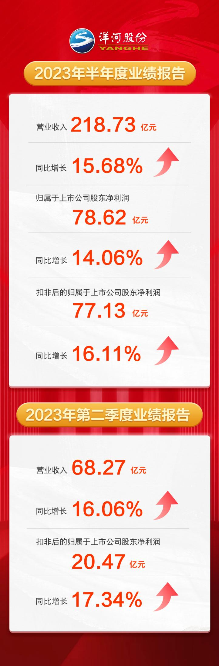 8月29日,洋河股份披露中报,2023年上半年实现营业收入218.73亿元,比上年同期增长15.68%;归母净利润78.62亿元,同比增长14.06%;扣非归母净利润77.13亿元,同比增长16.11%。