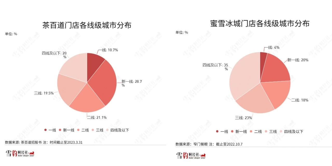 在门店分布上,二者也有不同的侧重。茶百道的门店主要分布在一二线城市,占比60.5%,蜜雪冰城则将57%的门店布局在三线及以下城市。