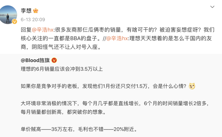 产品狂人李想很可能将更大精力放在内部卷最新纯电产品了,因此无暇分身在微博上对线。