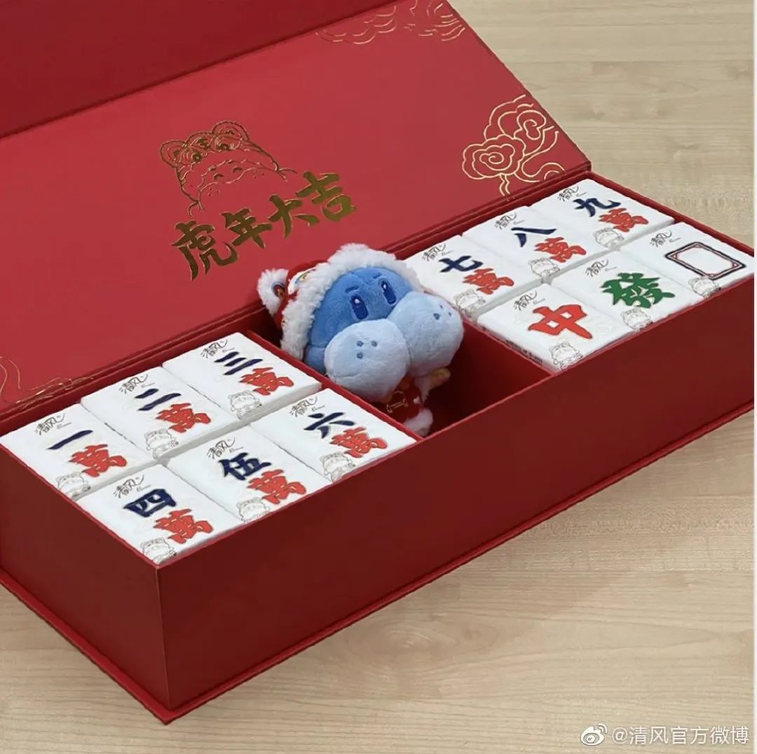 清风的麻将纸巾,可以根据包装凑成“清一色”、“大三元”、“大四喜”等好牌,趣味玩法,年味就有了。
