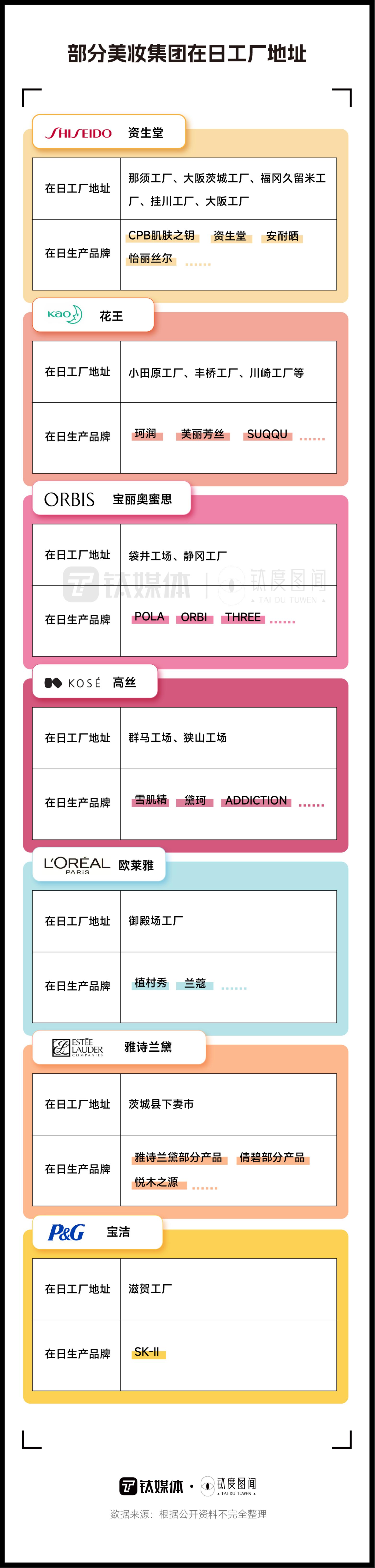 据钛媒体·钛度图闻不完全整理,包括资生堂、花王等在内的日系本土品牌在日本有多个工厂,大都位于日本的关东、中部以及九州地区,距福岛有一定的距离。除了本土品牌,不少国际美妆集团也在日本有生产工厂,比如欧莱雅的生产工厂在位于日本中部地区的静冈县御殿场工厂,在日主要生产包括植村秀、兰蔻等品牌的部分产品;宝洁的生产工厂是在位于日本近畿地区东部的滋贺工厂,是SK-II品牌的生产地,SK-II曾在今年6月份涉嫌生产地受到核污染而被关注,当时其母公司宝洁声称:“所有SK-II产品均在中国指定下的相关实验室进行严格的产品安全测试,所有SK-II产品均可安全使用。”