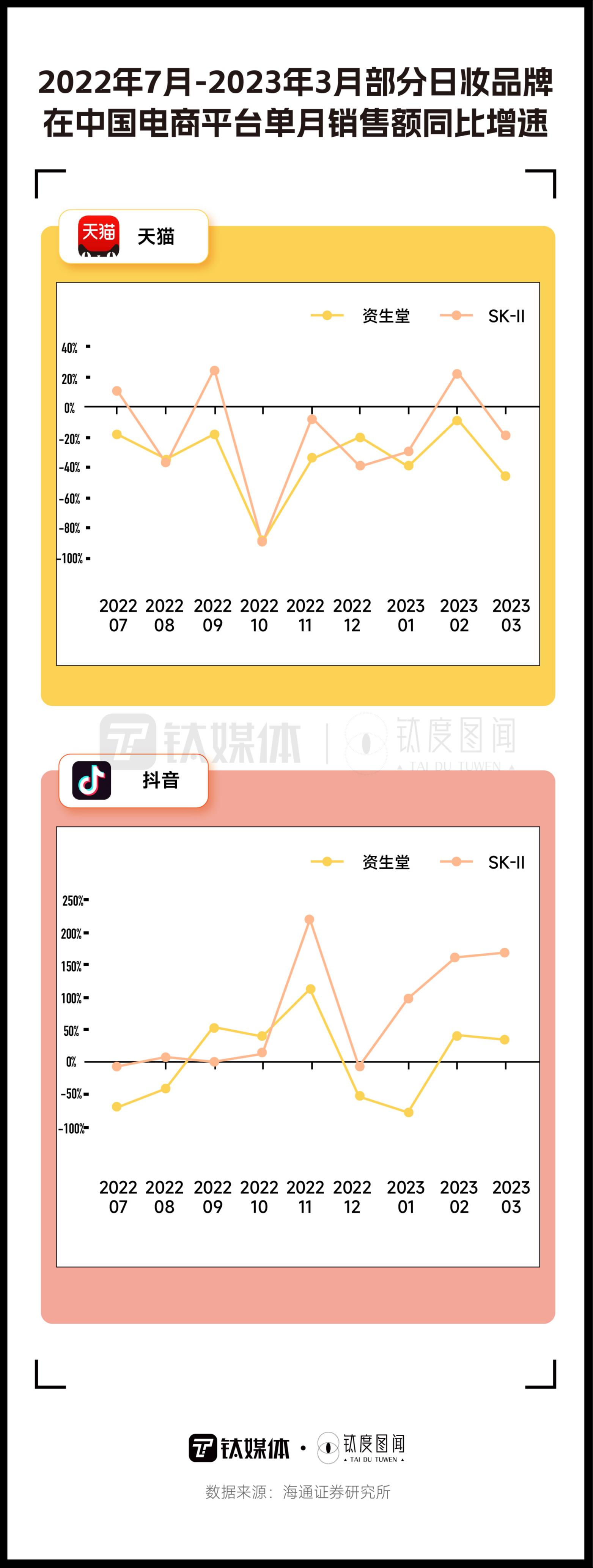 从日妆在中国的销售数据来看,日妆品牌也略显低迷。数据显示,在2022年7月-2023年3月的9个月间,资生堂和SK-II在中国电商平台的销售增速为负数。其中,这两个品牌在天猫的销售增速更为低迷。