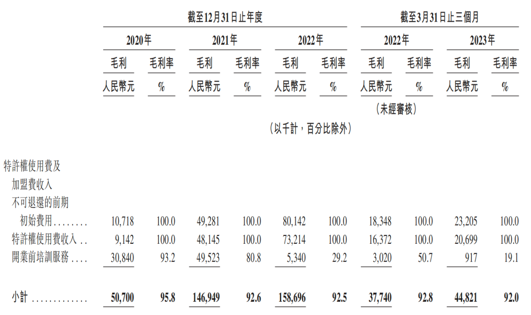 不过在原材料和包材收入面前,其加盟费不值一提。以2022年为例,42.32亿收入中,约38.13亿是卖原料和包材的收入,2.1亿元左右的设备收入,加盟费收入不到2亿。