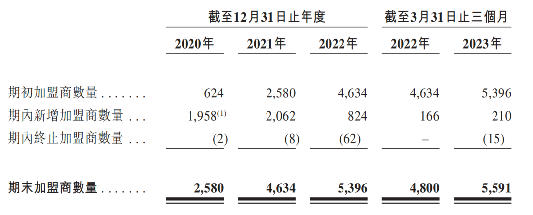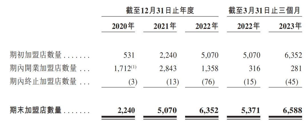 2020年茶百道新增加盟门店1712家,2021年新增2843家,2022年新增1358家,三年时间新增5913家加盟门店,平均一天落地5.5家。2023年一季度,茶百道新增加盟店数量同比少35家,同时终止加盟店数量同比多30家。2022年后,茶百道的速度明显降下来了,但这并不影响基本盘。