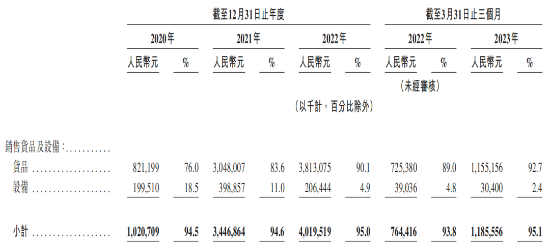 向加盟店销售货品及设备也是茶百道最核心的收入来源。2020年至2023年一季度,茶百道实现营收10.80亿元、36.45亿元、42.33亿元、12.47亿元,其中来自销售货品及设备的收入占总收入比例均在93%至95%之间。