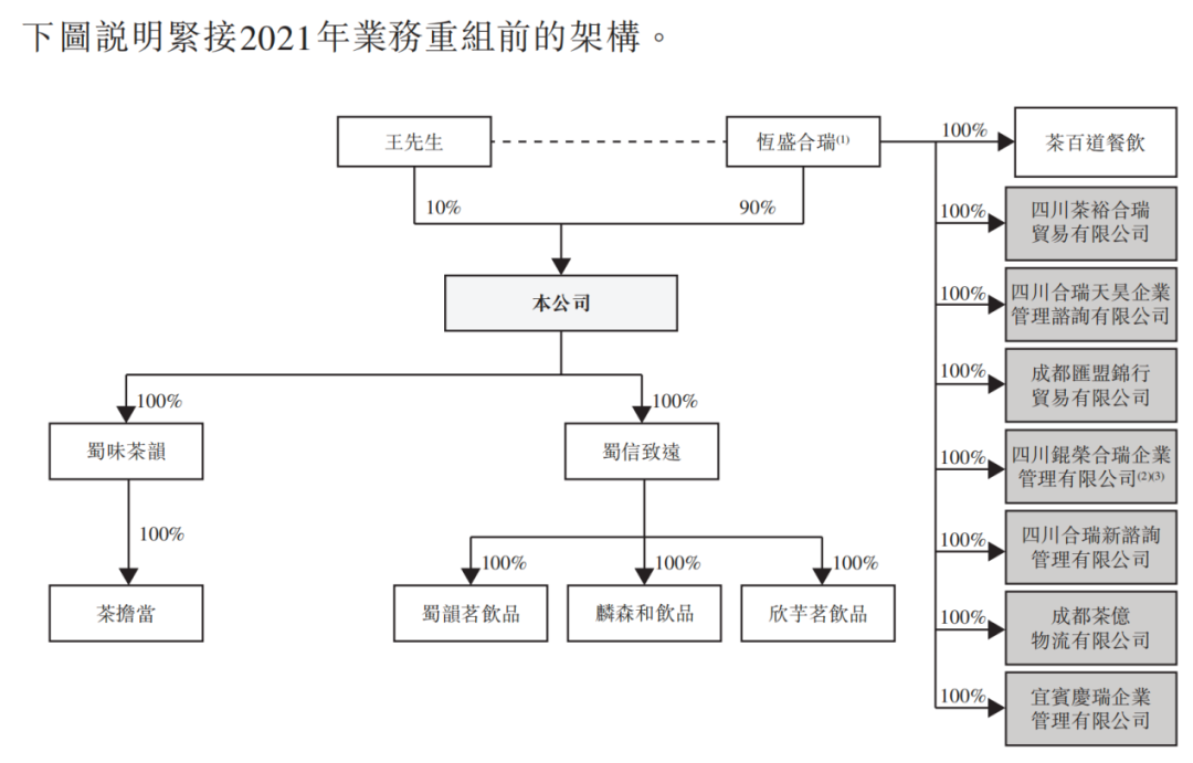 成立之初,茶百道由恒盛合瑞和王霄锟分别持股90%和10%。成立仅2个月后,王霄锟迫不及待将恒盛合瑞当时经营业务、合同、协议、资产/负债、人员、资料及账号注入茶百道。截止递表前,恒盛合瑞及其子公司并无参与任何实质性业务。
