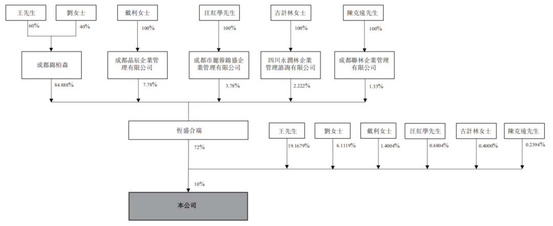 恒盛合瑞由成都锦柏森、戴利、汪红学、古计林、陈克远分别持有84.89%、7.78%、3.78%、2.22%、1.33%股权。成都锦柏森则由王霄锟和刘洧宏分别持股60%和40%。