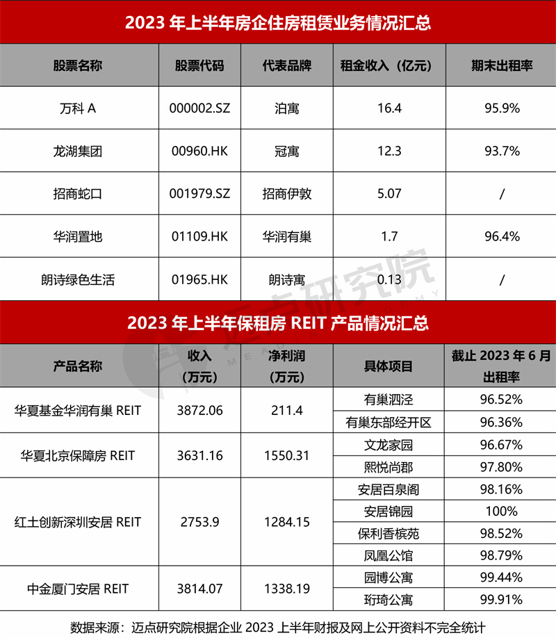 2023上半年,房地产行业整体形势依然严峻,部分上市企业或推迟财报披露、或即将甚至已经摘牌。根据已披露的2023上半年财报,万科、龙湖、招商蛇口、华润置地、朗诗绿色生活等在住房租赁板块均实现稳健增长。同期,4支保租房REIT产品的良好财务表现,也为接下来更多企业进军该领域和金融化提供了样本参考。
