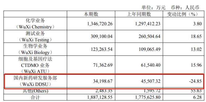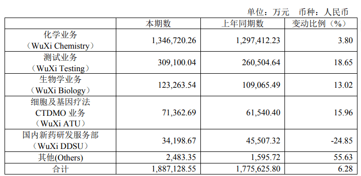从收入来看,药明康德营收分为五部分,分别为化学业务、测试业务、生物学业务、细胞及基因疗法以及国内新药研发服务部。