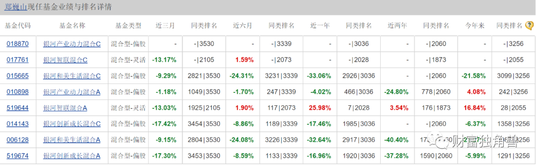 除了郑巍山业绩不理想外,杨琪业绩也不太理想。杨琪曾任职于上海原点资产管理有限公司研究部,2011年11月加入银河基金管理有限公司,从事投资、研究相关工作。2017年1月起担任银河君信灵活配置混合型证券投资基金的基金经理,2017年4月起担任银河美丽优萃混合型证券投资基金的基金经理,2017年7月起至2021年12月16日担任银河君耀灵活配置混合型证券投资基金的基金经理,2019年2月起担任银河转型增长主题灵活配置混合型证券投资基金的基金经理。
