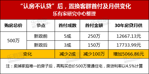 可以直观看到,“认房不认贷”前后,置换群体的首付比例减少两成,首付金额减少100万元,但月供增加约5000元。