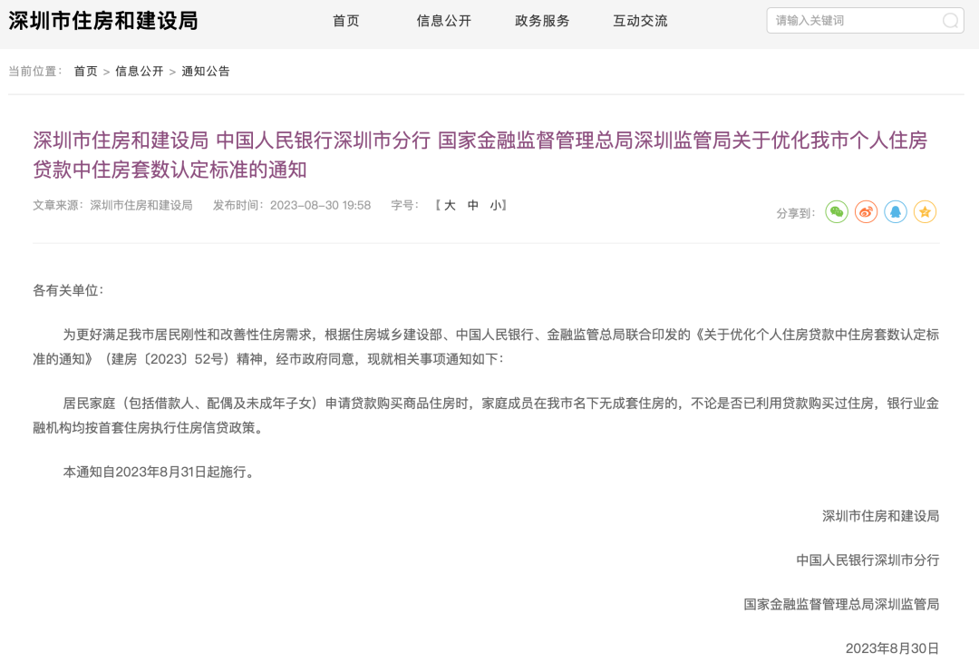 8月30日晚间,深圳市住房和建设局、中国人民银行深圳市分行、国家金融监督管理总局深圳监管局发布《关于优化我市个人住房贷款中住房套数认定标准的通知》(以下简称《通知》)。