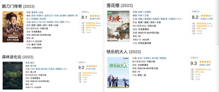 但另一面,暑期档剧综又不缺高分作品。据不完全统计,剧集市场有6部作品豆瓣评分超8分,多年未曾有突破的情景喜剧也出现了豆瓣8.1的《鹊刀门传奇》;综艺《森林进化论》《快乐的大人》豆瓣超过9分,8分以上综艺更是涵盖了推理、职场、音乐、恋综等多个领域。