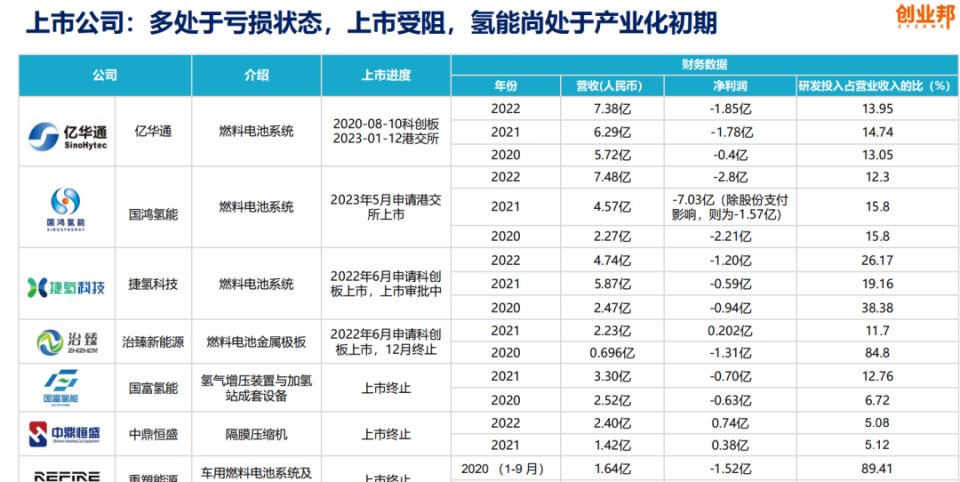 中游储存运输的高成本自然会影响氢能产业链的商业化以及下游的应用普及。这点从创业邦研究院发布的《2023中国氢能产业研究报告》中也能体现。根据报告,目前国内氢能产业的融资天使轮和A轮的初期融资较多,且较集中于上游产业。相较之下,多个中下游的氢燃料电池、隔膜压缩机等企业的上市情况均不太顺利。