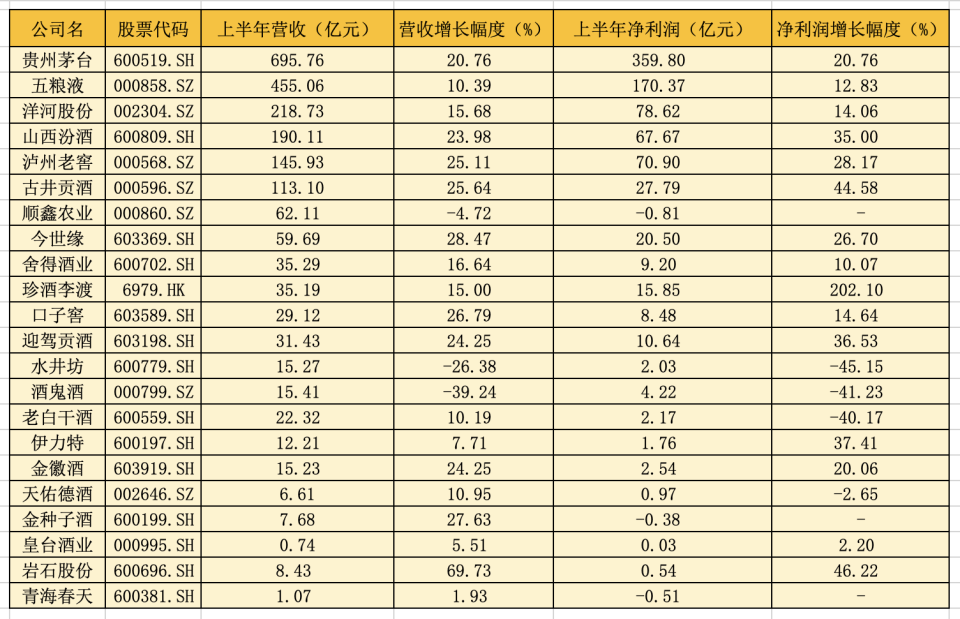 上市酒企上半年业绩情况。时代财经整理