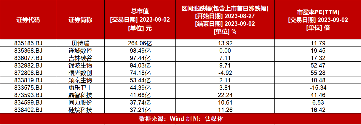 个股方面,北交所市值排名前十的个股仅曙光数创下跌,跌幅为4.92%,“市值一哥”贝特瑞涨幅13.92%;连城数控持平;吉林碳谷涨幅7.10%;锦波生物涨幅9.71%;颖泰生物涨幅10.48%;康乐卫士涨幅3.81%;鼎智科技涨幅22.24%;同力股份涨跌10.61%;硅烷科技涨幅11.26%。