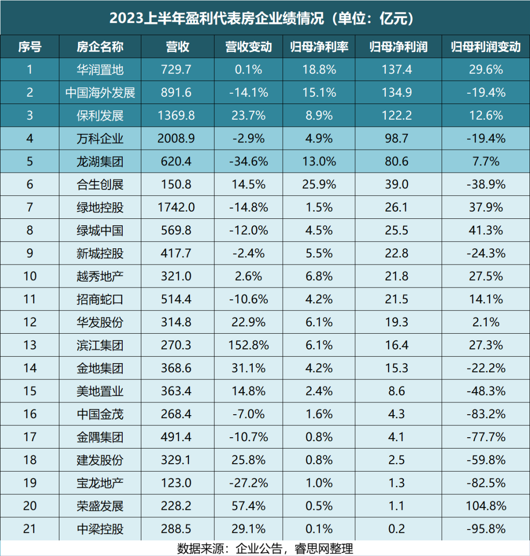 上半年,龙头上市房企基本都实现盈利,其中,华润置地、中海地产与保利发展的净利润均超100亿元,是上半年盈利房企的TOP3。