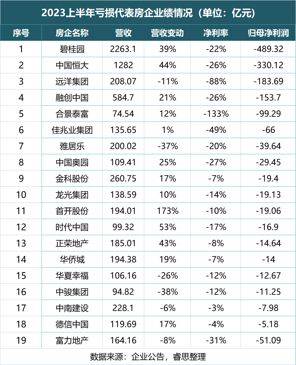 亏损企业中,共计4家房企的亏损额超过100亿元,分别是碧桂园(-489.32亿)、中国恒大(-330.12亿)、远洋集团(-183.69亿)、融创中国(-153.7亿元);合景泰富、富力地产、佳兆业今年上半年的亏损同样超过了50亿元。