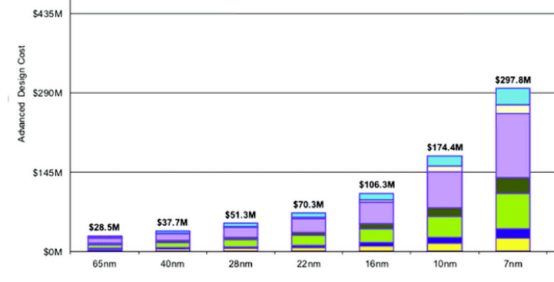 知名半导体研究机构Semiengingeering统计了不同工艺下芯片所需费用,其中7nm节点需要的费用已经达到了2.97亿美元;