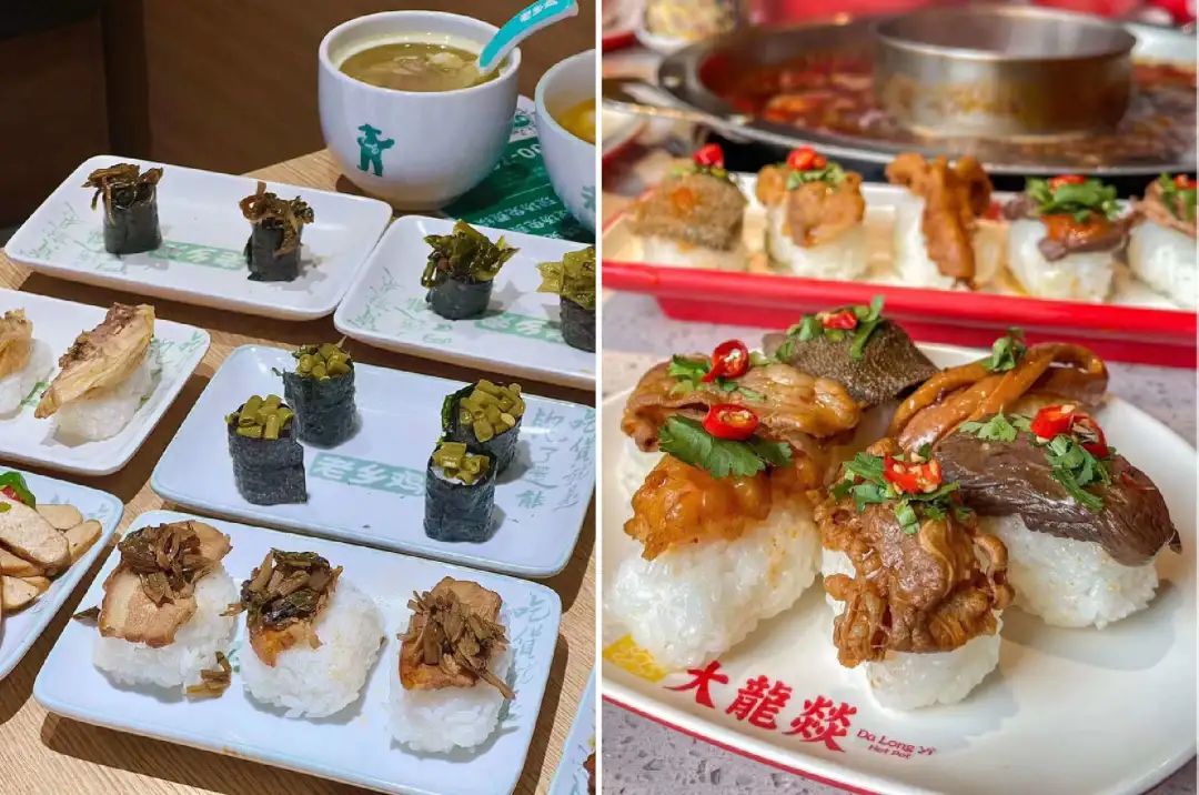 比如,新中式寿司之老乡鸡牌Omakase,葱油鸡寿司、酸豆角军舰;热爱火锅的消费者,更直接前往海底捞、大龙燚等知名火锅品牌,来了一波“二创”,牛油辣锅凤爪寿司、寿喜肥牛香菇寿司等。