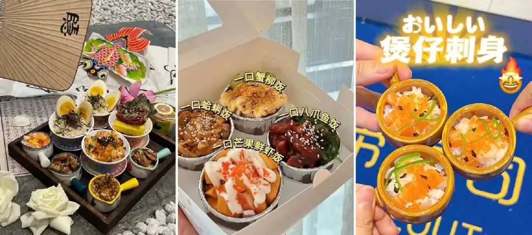 重庆奈赐寿司的创意新品,新中式盖碗寿司,将中式传统器具与食材和寿司形式结合,推出茶叶蛋寿司、牛油果寿司等;更有不少品牌直接重新定义寿司,推出“一口饭”系列、“现炒热菜”系列等。