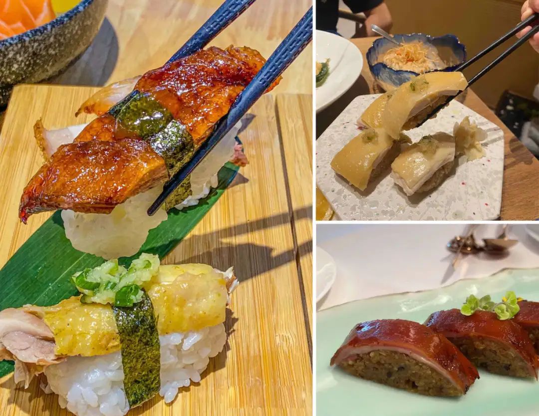 其实,在这之前,关于“中式寿司”的探索也有不少先行者。比如一些高价日料店、中式Omakase品牌等,也曾通过鹅肝、和牛、海胆等食材推出过创意寿司。
