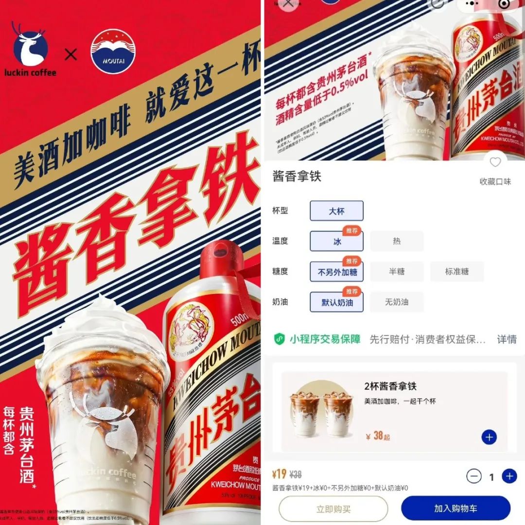 于是,当瑞幸与茅台联名推出酱香拿铁时,一种由差异化导致的张力,让它具备了天然的话题度——这是茅台冰激凌曾经向往、但从未达到过的待遇。对于年轻人而言,19块钱一杯的酱香拿铁,价格友好度远超 66块钱一杯的茅台冰激凌,瑞幸的万店规模,更是大大降低了购买门槛。