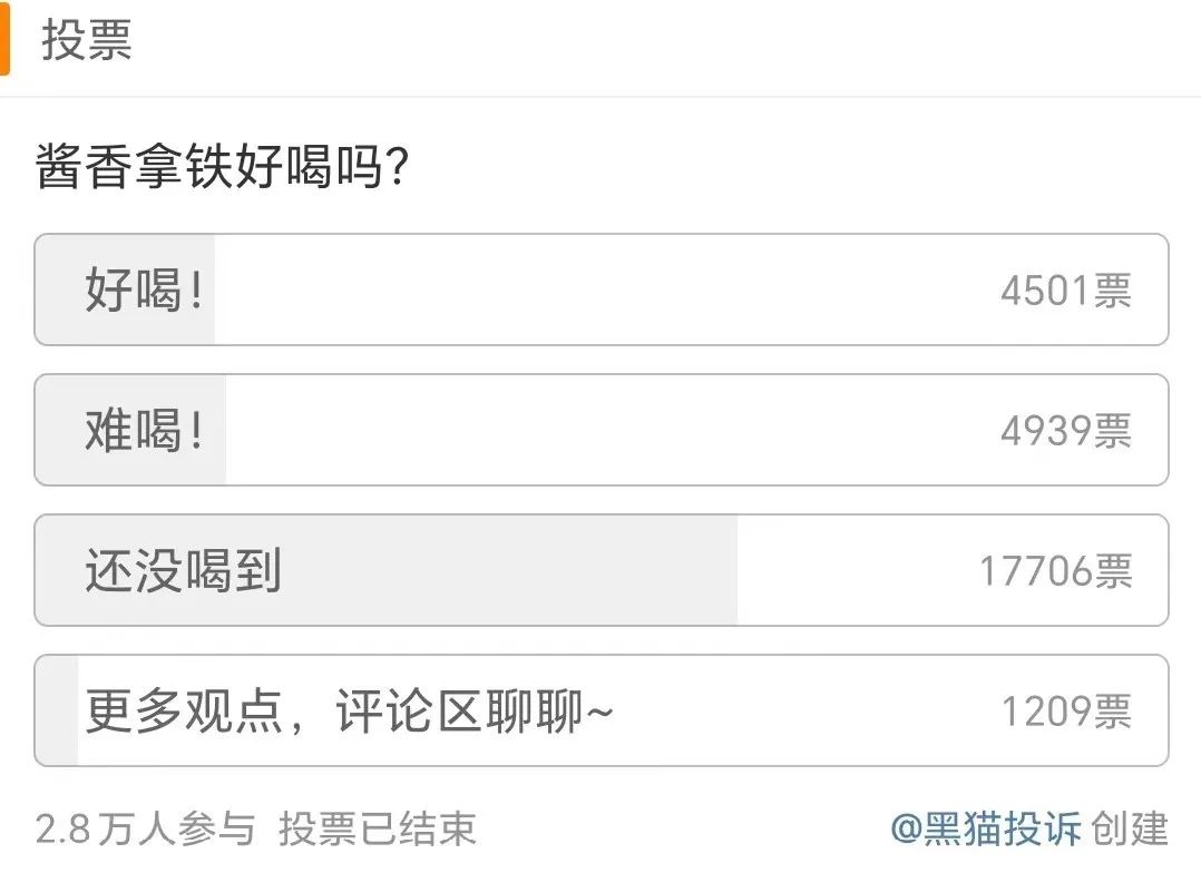 黑猫投诉在微博上发起了#酱香拿铁好喝吗?# 的投票话题,约有4500多人选择好喝,4900多人选择难喝,还有1.7万人选择还没喝到。