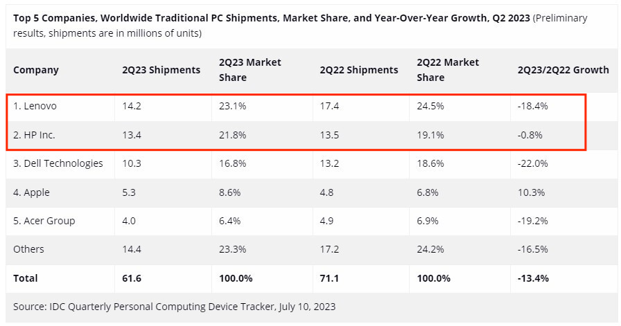 具体来看,联想二季度出货量为1420万台,排名第一,但出货量同比下滑了18.4%,市场份额降至了23.1%;惠普则以1340万台出货量排名第二,同比小幅下滑0.8%,市场份额升至21.8%。惠普与联想的市场份额差距正在缩小。