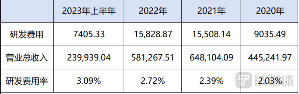 与销售费用高企相反的是,公司在研发创新上面的投入可谓是抠抠搜搜。财务数据显示,2020年—2023年上半年,公司的研发费用分别为9035.49万元、1.55亿元、1.58亿元、7405.33万元,占当期营业收入的比例分别为2.03%、2.39%、2.72%和3.09%。