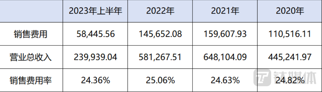 由于市场竞争激烈,公司在销售推广费用上也毫不手软。财务数据显示,2020年—2023年上半年,公司的销售费用分别为11.05亿元、15.96亿元、14.57亿元、5.84亿元,占当期营业收入的比例分别为24.82%、24.63%、25.06%、24.36%。也就是说,公司每年四分之一的收入都用来进行销售推广。