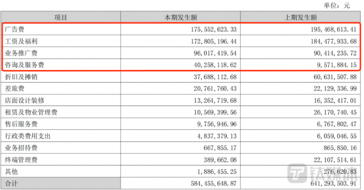 而今年的半年报显示,公司的销售费用主要集中在广告费、工资及福利、业务推广费上。其中,广告费高达1.76亿元,业务推广费为9601.74万元,咨询及服务费4025.81万元。