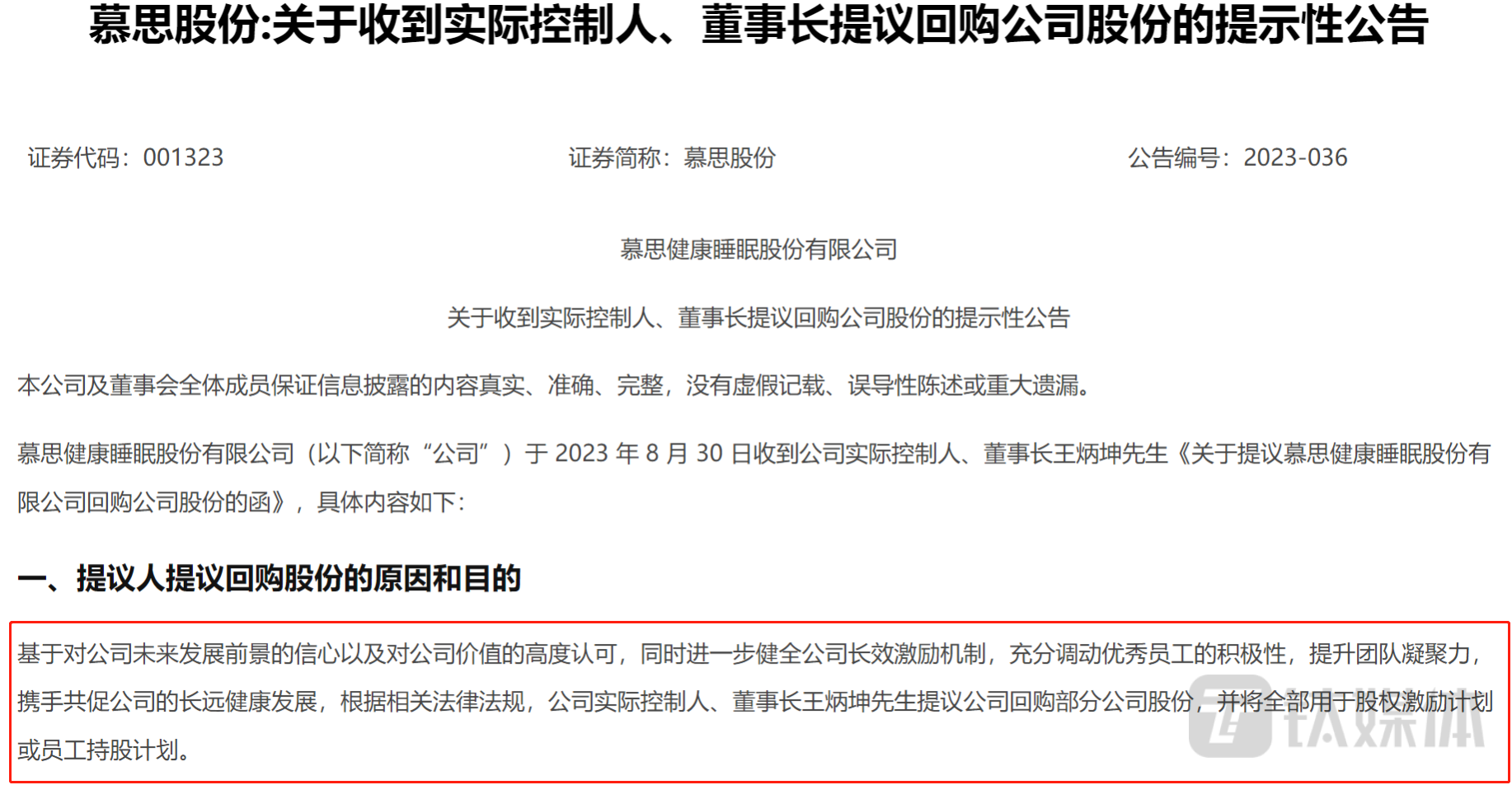 实际上,8月31日,公司发布公告称收到公司实际控制人、董事长王炳坤先生《关于提议慕思健康睡眠股份有限公司回购公司股份的函》。