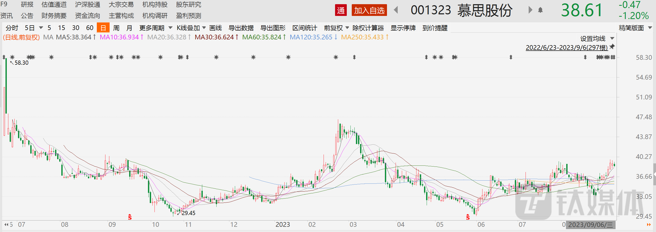 2022年6月23日,公司登陆深交所主板发行价格为38.93元,前复权股价一度最高涨至58.3元,然而此后一直处于震荡状态,2023年3月以后更是持续下跌,最低一度降低至29.45元。截至9月6日,公司股价仍低于发行股价。