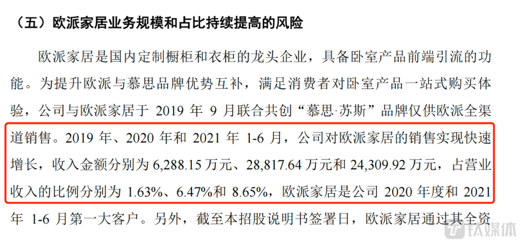 据了解,2019年9月,公司与欧派家居联合共创“慕思·苏斯”品牌,仅供欧派家居全渠道销售。招股说明书显示,2019年、2020年和2021年上半年,公司对欧派家居的销售金额分别为6288.15万元、2.88亿元和2.43亿元,占当期营业收入的比例分别为1.63%、6.47%和8.65%。与此同时,欧派家居也是公司2020年和2021年上半年的第一大客户。